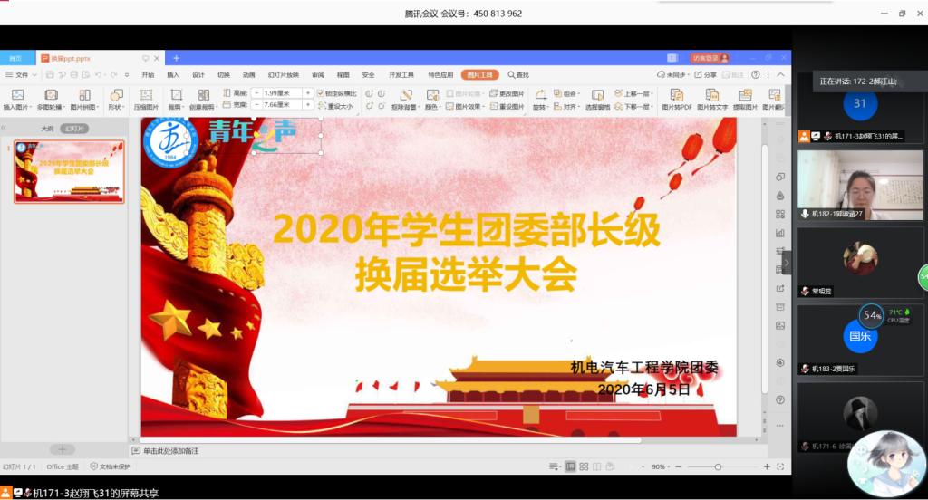 为选拔优秀团干部,传承学院优良的学生干部风气,壮大学院学生干部队伍,pg游戏电子模拟器于6月5日通过腾讯会议举行学生团委线上换届活动,团委老师曲季、团委副书记赵翔飞、各部门部长以及所有竞选人员参加了此次会议。