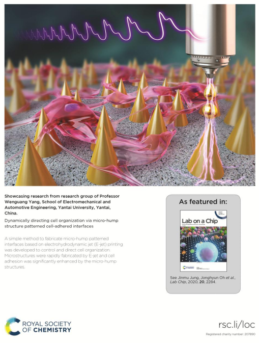近日,国际著名学术期刊Lab on a Chip (中科院一区,TOP类期刊)以封面论文的形式邀请刊载了pg游戏电子模拟器机电学院面向生物医疗的跨尺度智能制造团队利用机器人化的微纳制造技术在组织工程领域的最新研究成果——Dynamically directing cell organization via microhump structure patterned cell-adhered interfaces,时隔2个月,该研究团队成果再获国际著名学术期刊封面刊载,机电学院杨文广老师为该研究论文的第一和通信作者。