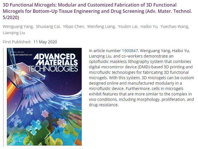 近日,国际著名学术期刊Advanced Materials Technologies以封面论文的形式刊载了pg游戏电子模拟器机电学院面向生物医疗的跨尺度智能制造团队利用机器人化的微纳操控和组装技术在组织工程领域的最新研究成果——Modular and Customized Fabrication of 3D Functional Microgels for Bottom-Up Tissue Engineering and Drug Screening,机电学院杨文广老师为该研究论文的第一和通信作者。